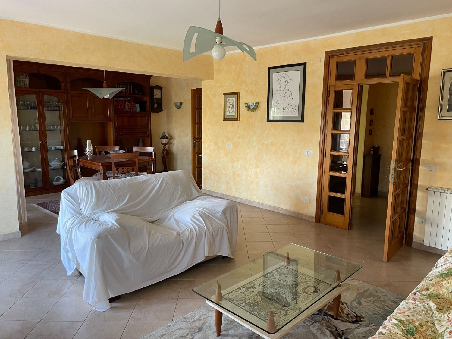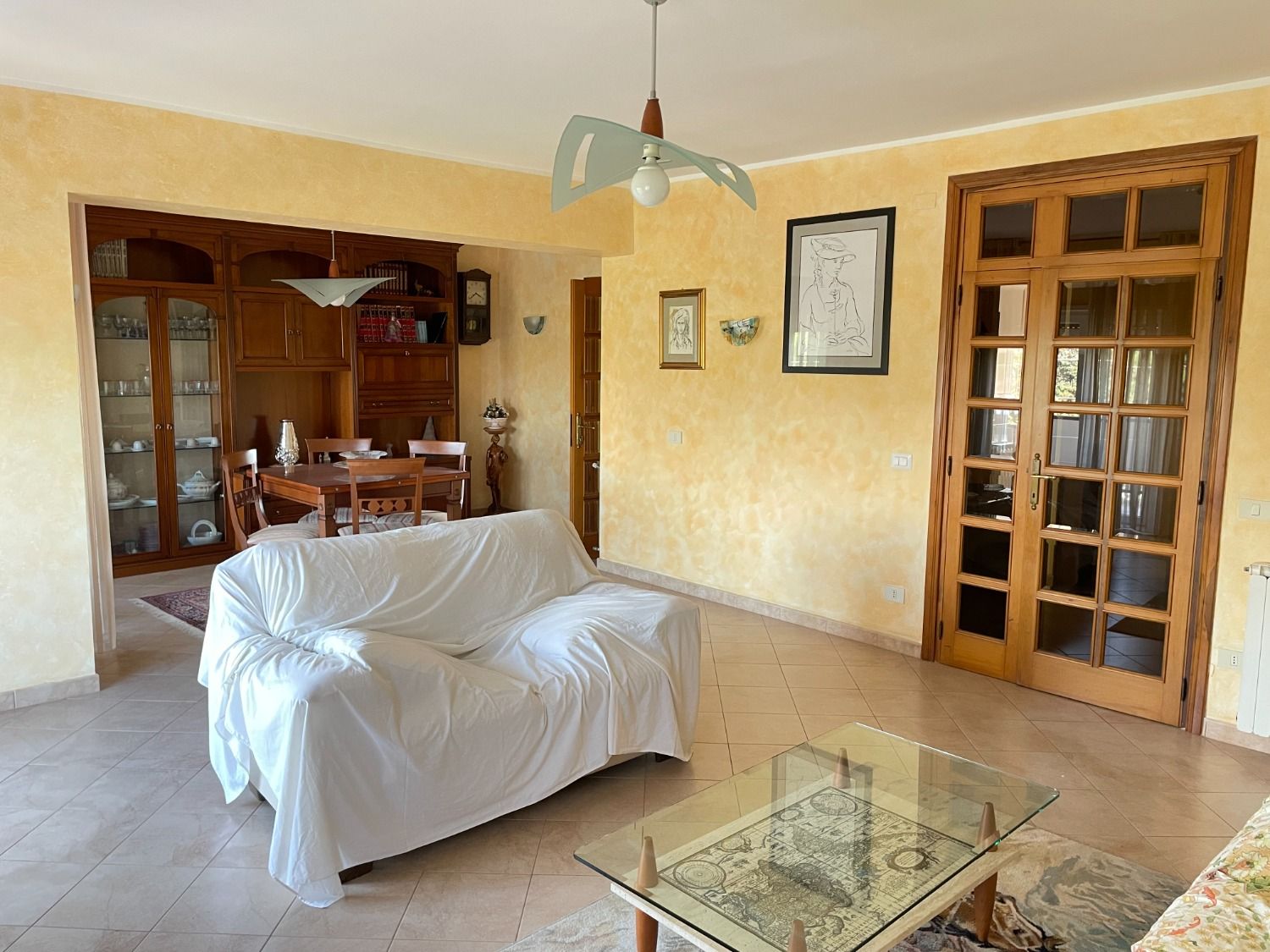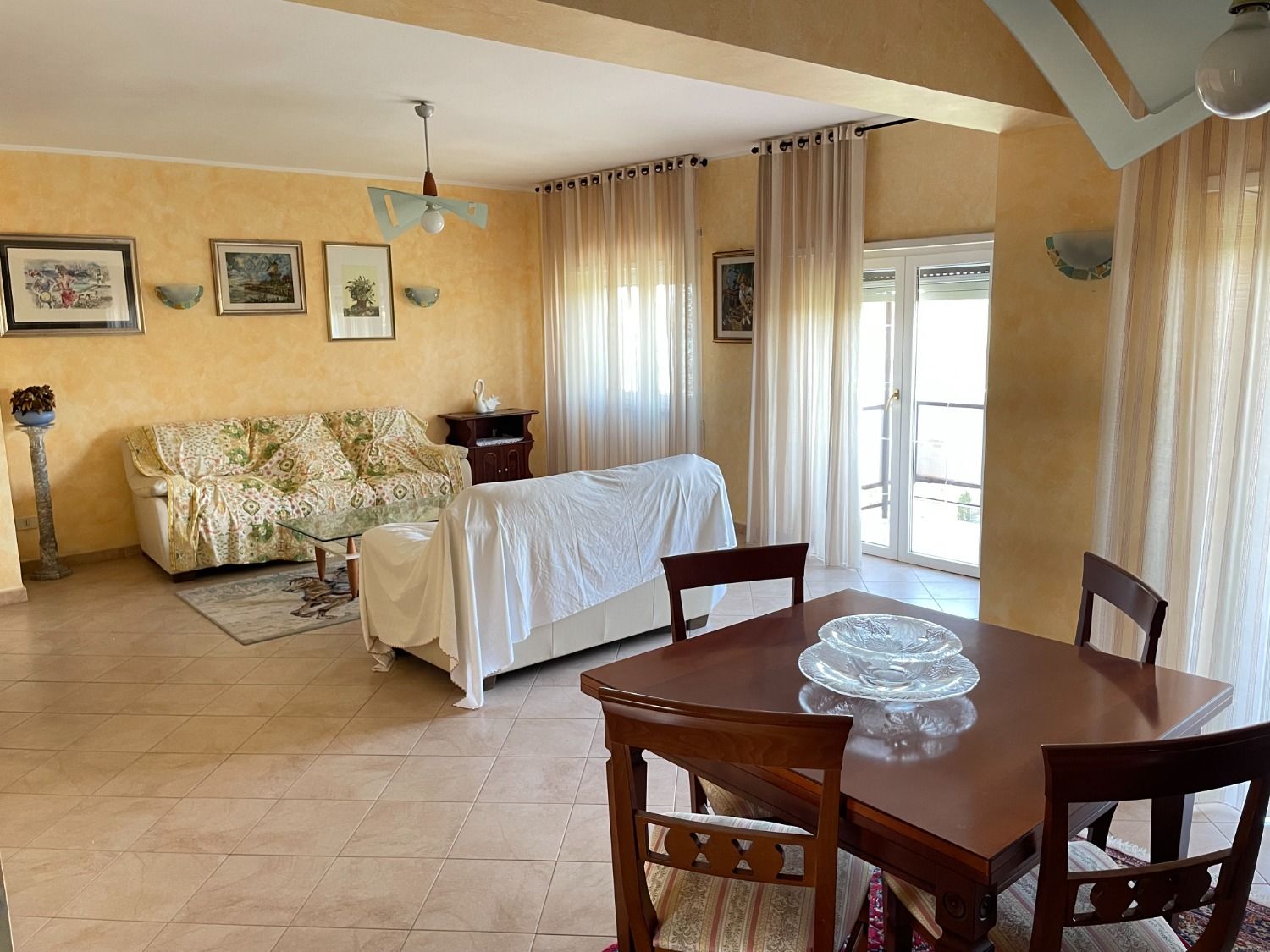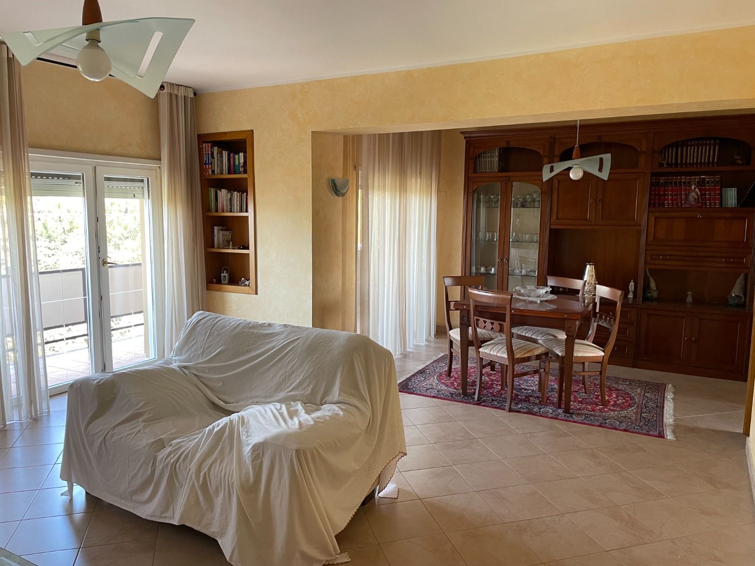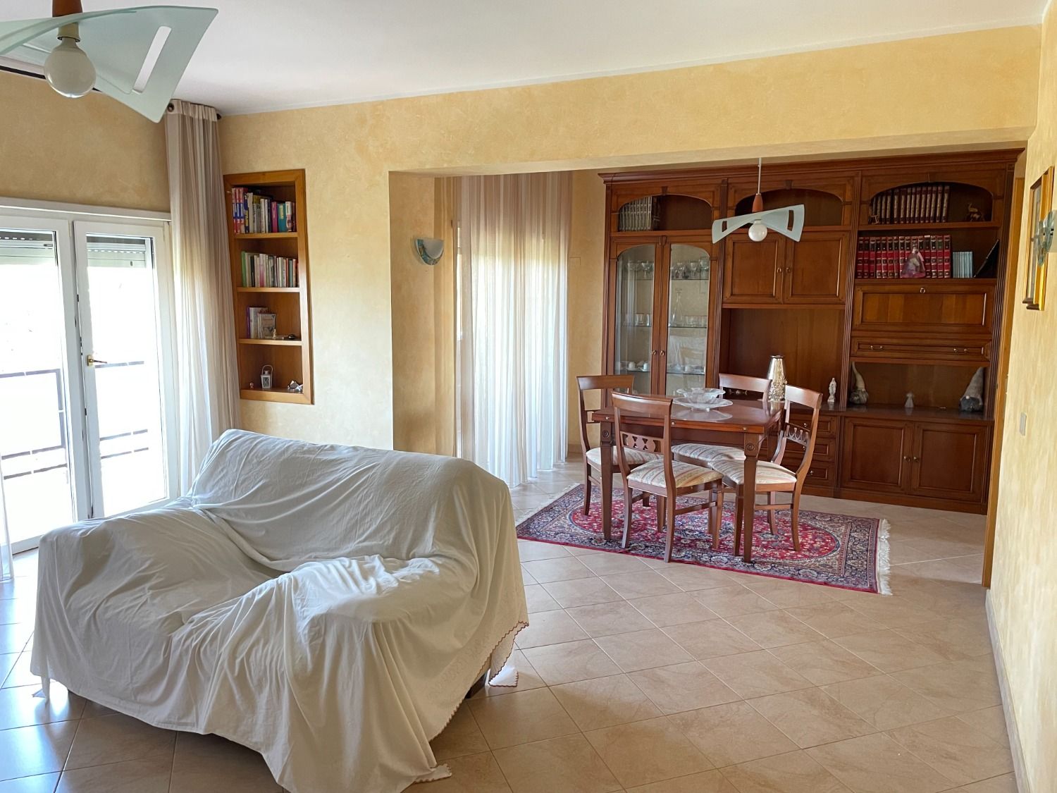 Il salone doppio è suddiviso in una zona living dotata di due divani con tre sedute ciascuno ed una zona pranzo con tavolo allungabile adatto ad ospitare fino a 8 persone, ideale per godere del vostro tempo libero in famiglia o per organizzare cene con amici. Le due ampie porte finestre con accesso sul primo dei due balconi garantiscono un’ottima luminosità