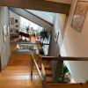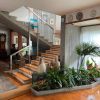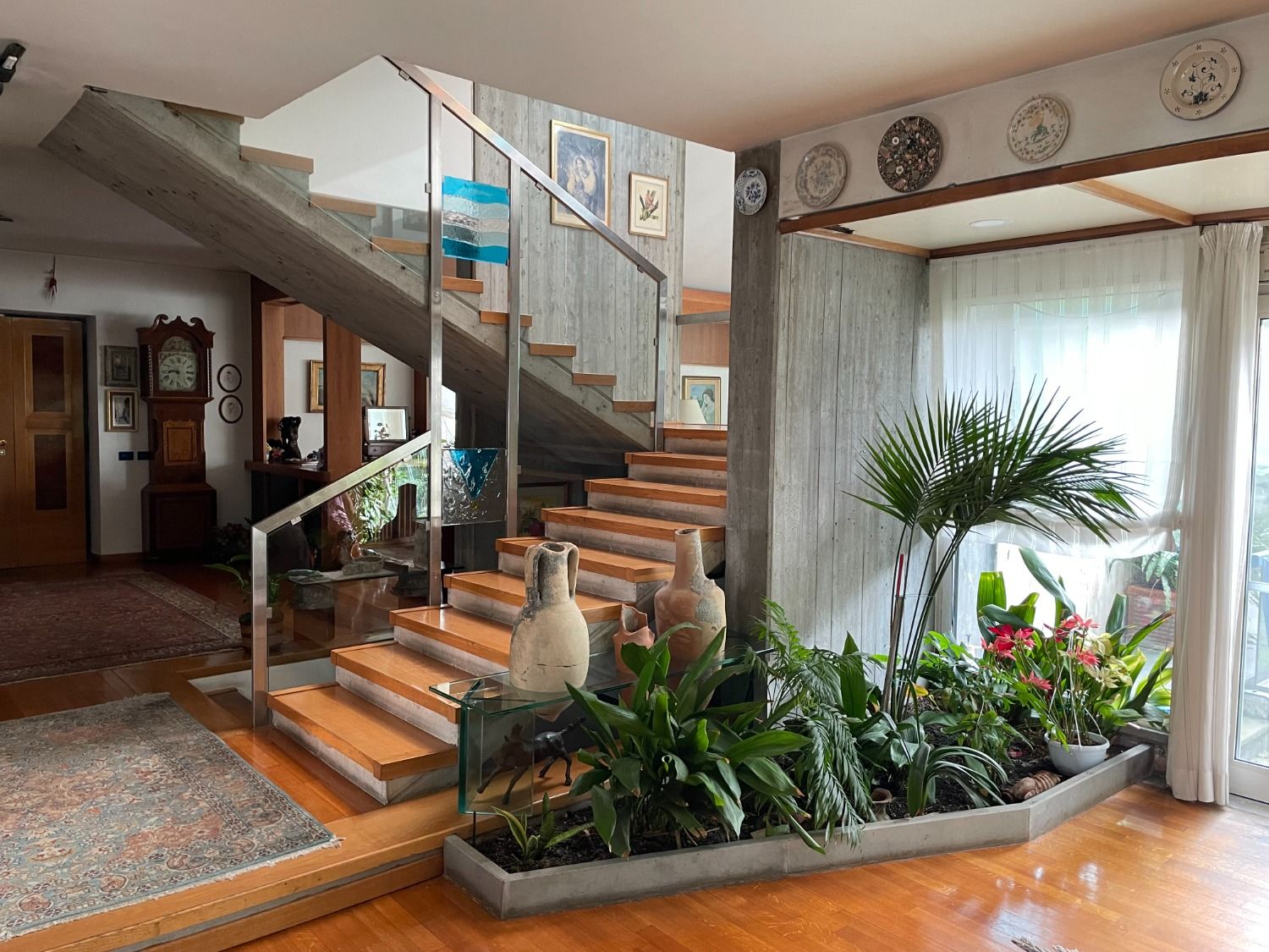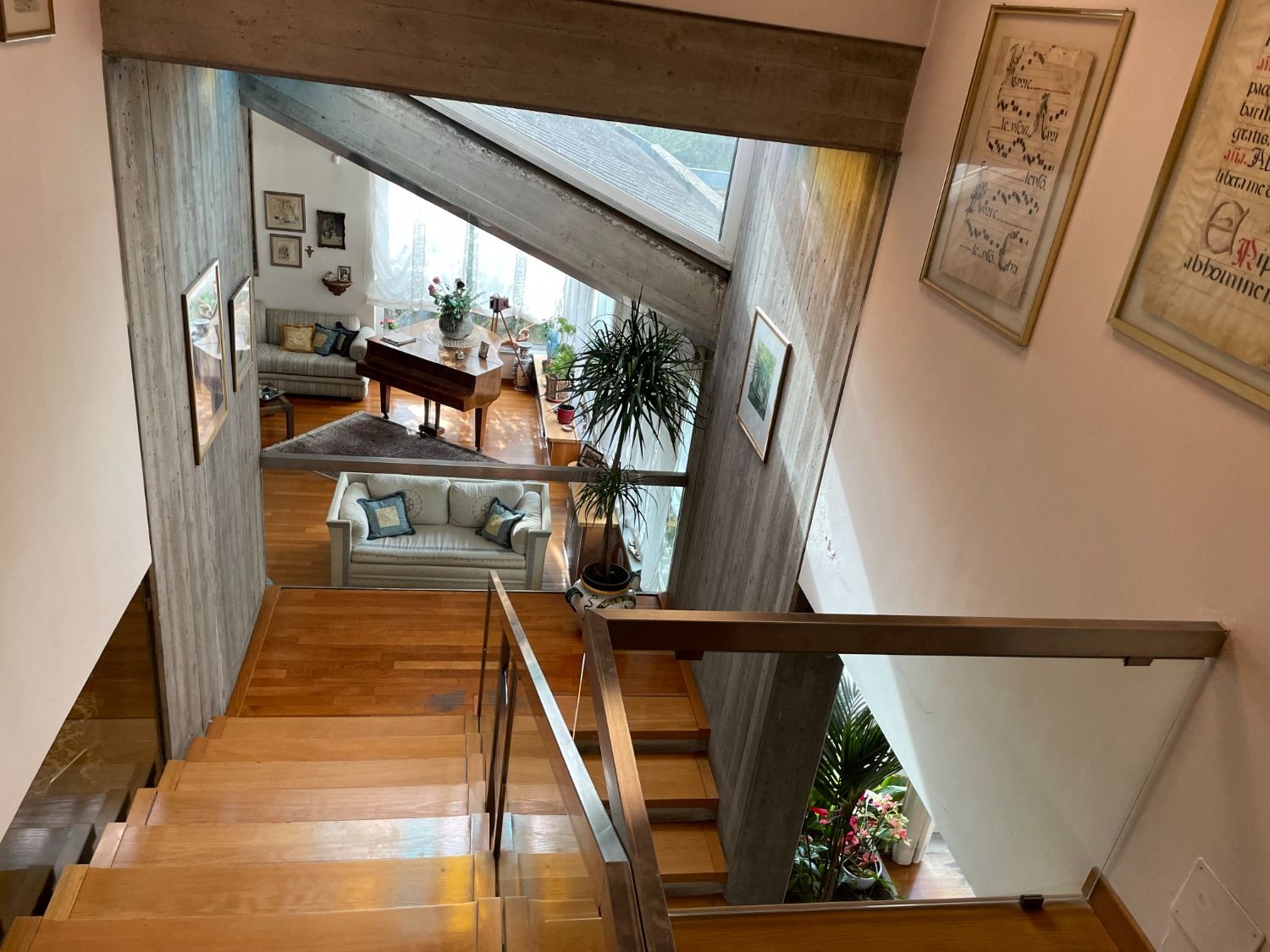 La scala realizzata in un mix ben riuscito di cemento armato, legno, acciaio e vetro, costituisce la spina dorsale della villa e conduce sia alla zona notte che al rustico.