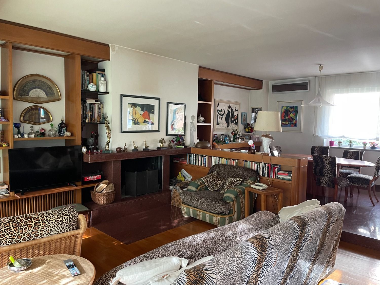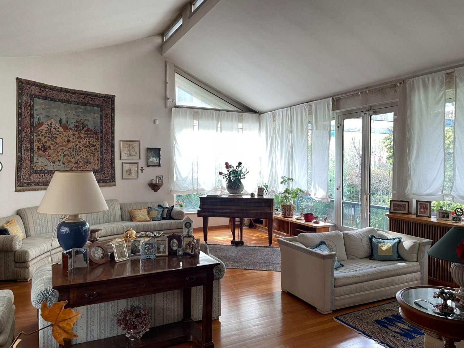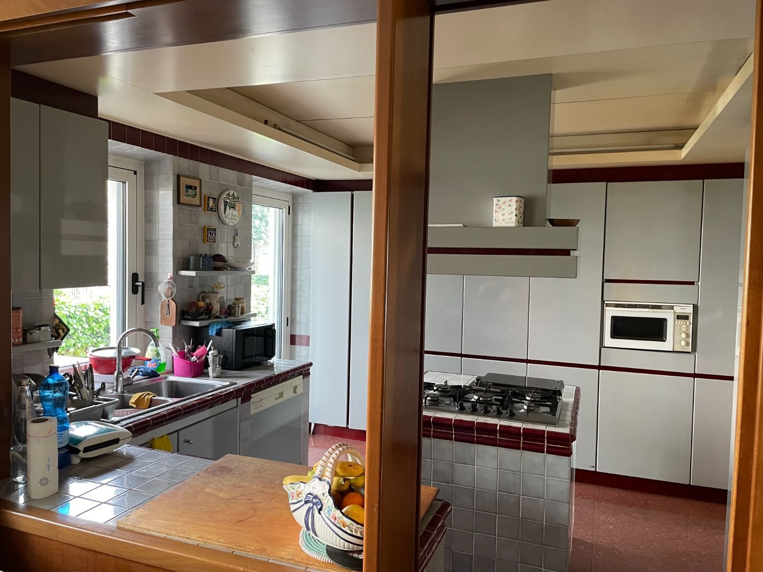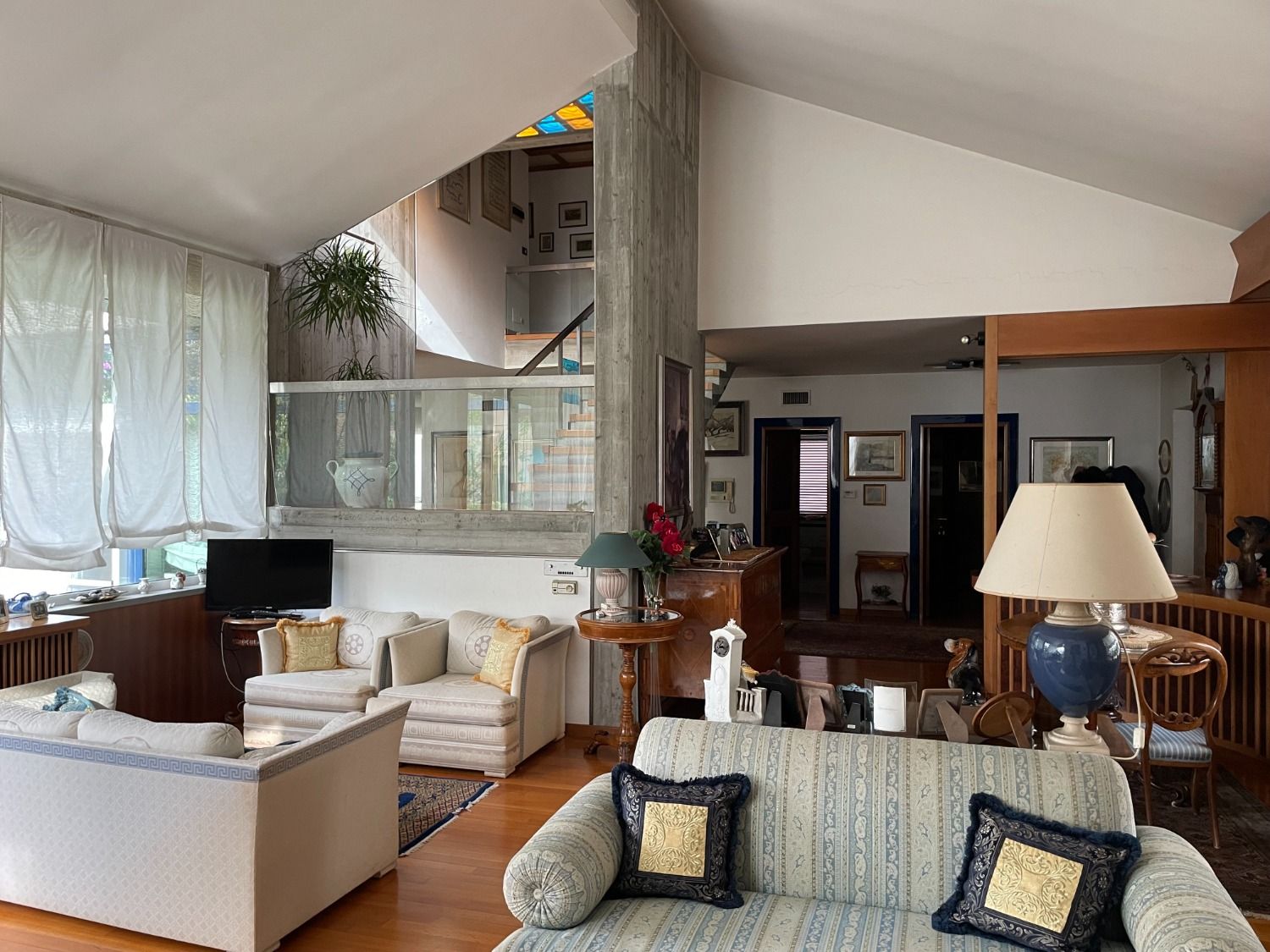 Il livello principale e più rappresentativo dello stile architettonico della villa è il piano rialzato che ospita la zona giorno. Un ampio ingresso introduce al luminoso salone, caratterizzato da pareti quasi completamente vetrate ed esposte verso il giardino perimetrale. La cucina modulare è direttamente collegata ad una zona pranzo che ospita un tavolo per 10 persone. Completano il livello una zona tv/relax, un comodo studio ed un bagno.